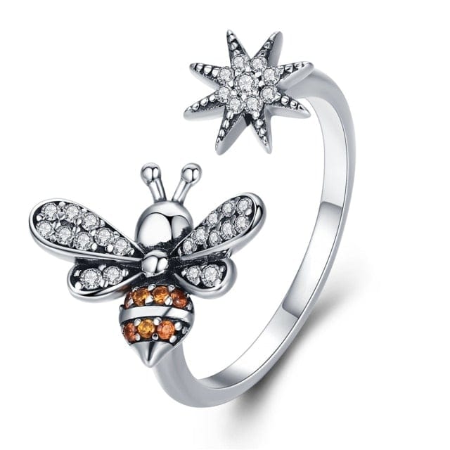 BAMOER 100% 925 Sterling Silver Trendy Bee & Daisy Flower Finger Rings for Women Adjustable Size Valentine Gift Jewelry SCR422