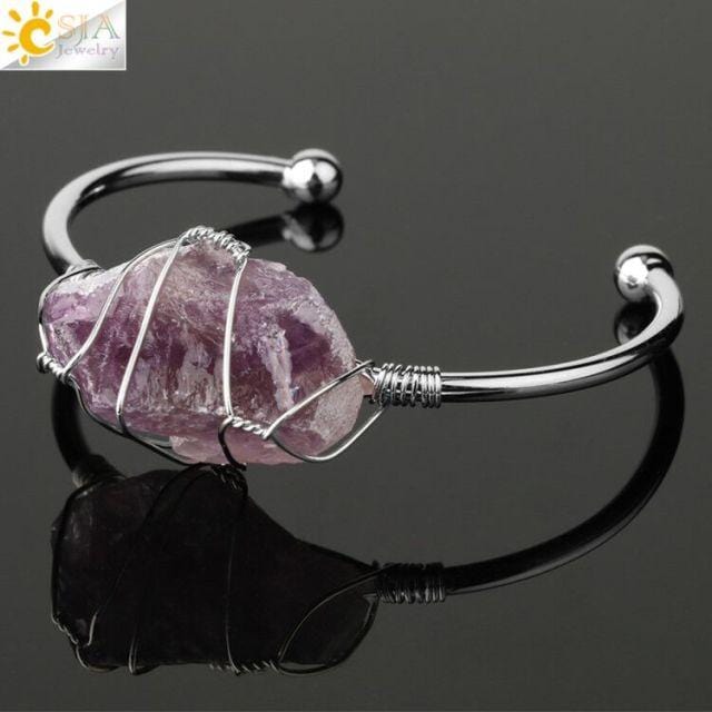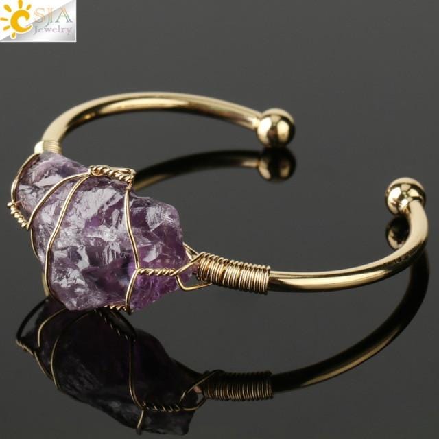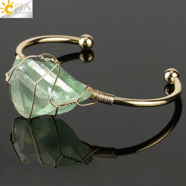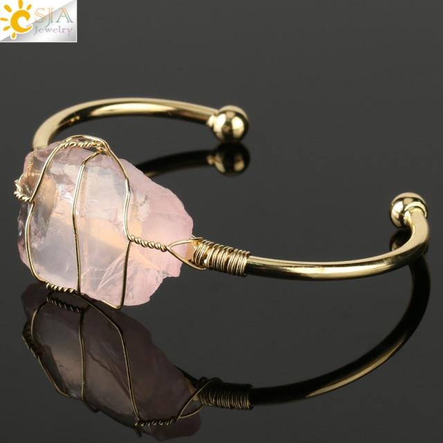 CSJA Natural Stone Bangles Cuff Copper Bracelets for Women Gold-Color Wire Wrap Irregular Crystal Quartz Girls Kids Jewelry G327