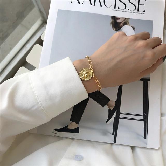 Punk Bracelets Carved Coin Head Bracelet Bangle Bohemian Circle Queen Thick Chain Tassel Pendant Bracelet Women Jewelry