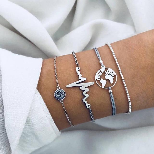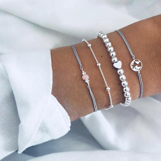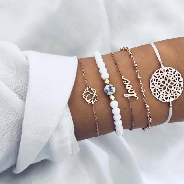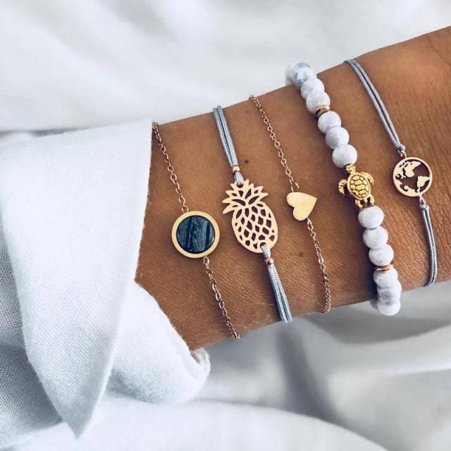 Women Bracelets Set Boho Gem Shell Turtle Leaf Bead Chain Leather Multilayer Bracelet Charm Lady Gold Jewelry Gift