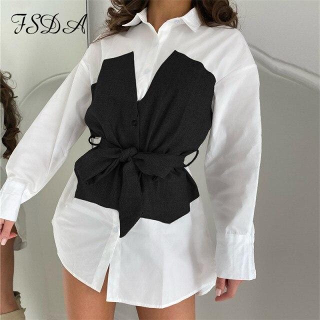 FSDA 2020 Patchwork Shirt Dress Houndstooth Long Sleeve Bandage Sashes Autumn Winter White Casual Mini A Line Dresses Fashion