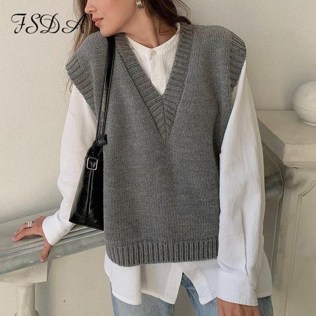 FSDA V Neck Knitted Vest Sweater Sleeveless Women Khaki Casual Pullover Black 2020 Autumn Winter Gray Jumper Fashion