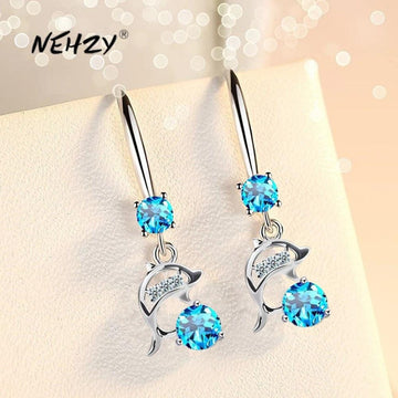 NEHZY 925 Sterling Silver New Woman Fashion Jewelry Purple Pink Crystal Zircon Dolphin Hot Sale Tassel Hoops piercing Earrings