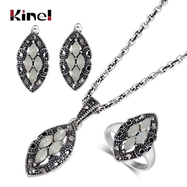 Kinel Women's Fashion Retro Jewelry Sets Antique Silver Color Mosaic Green Zircon Pendant Necklace And Earring Ring Jewelry Set