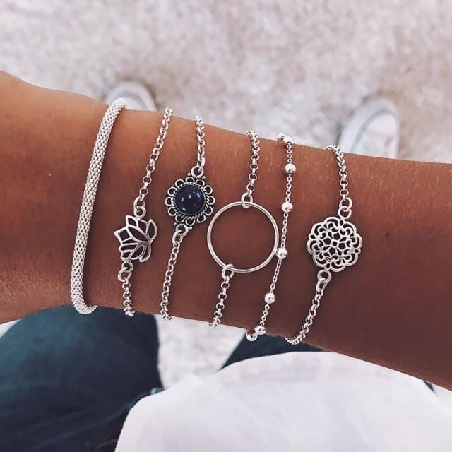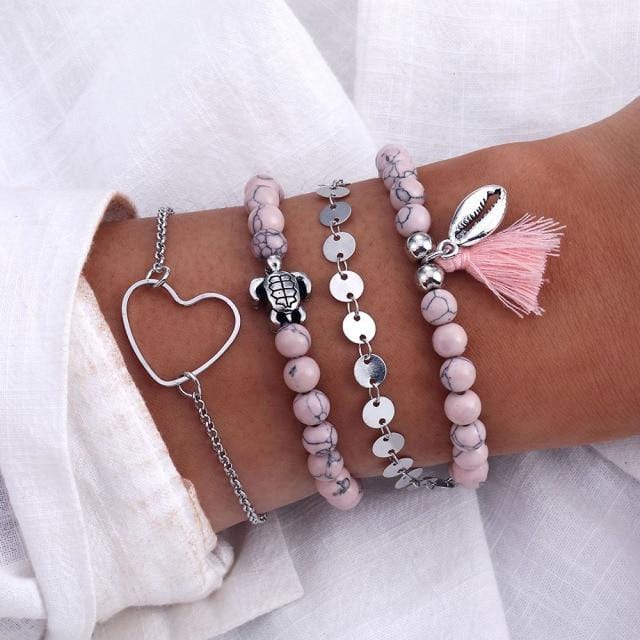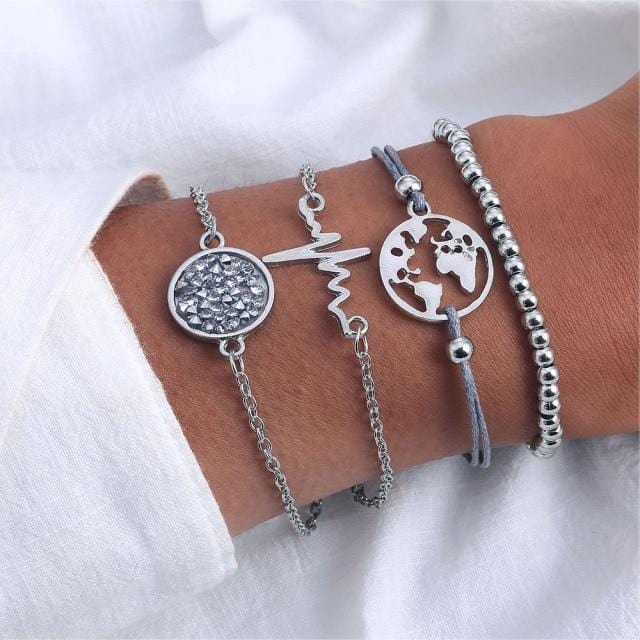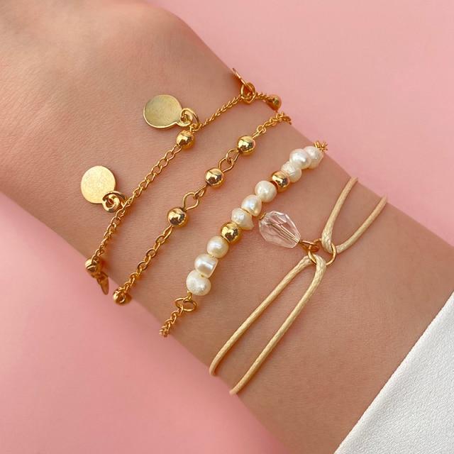 FNIO 4Pcs/Set Geometric Crystal Charm Bracelets for Women Gold Leaf Bangles Bracelets Set Simple Wrist Chain Lady Boho Bracelet