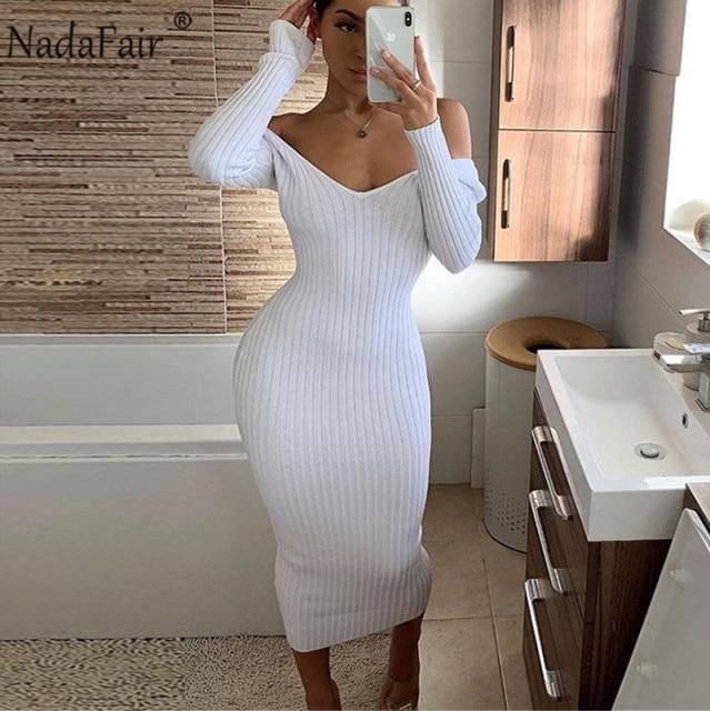 Nadafair V Neck Basic Sweater Dress Women Autumn Winter Long Sleeve Casual Knitted Stretchy Midi Bodycon White Woman Dress
