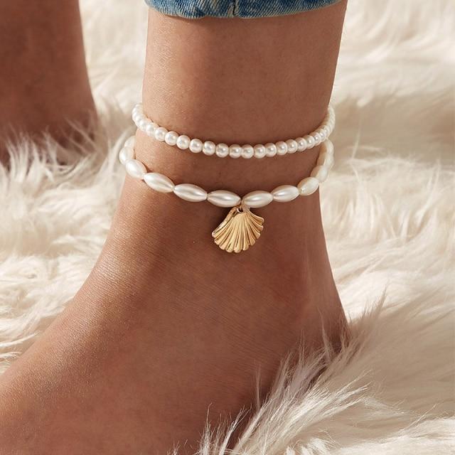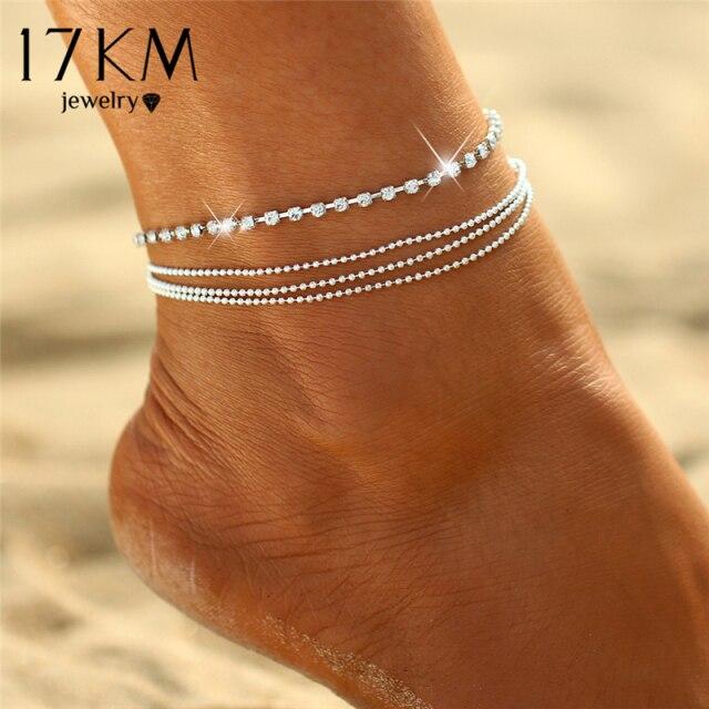 17KM Fashion Multilayer Crystal Pearl Anklets Set for Women Colorful Stone Shell Chain Anklet Beach Foot Bracelet Jewelry