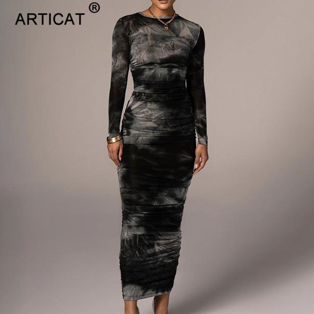 Articat Tie-Dye Print Ruched Christmas Dress For Women Long Sleeve Sexy Bodycon Winter Dress Elastic Pleated Casual Party Dress