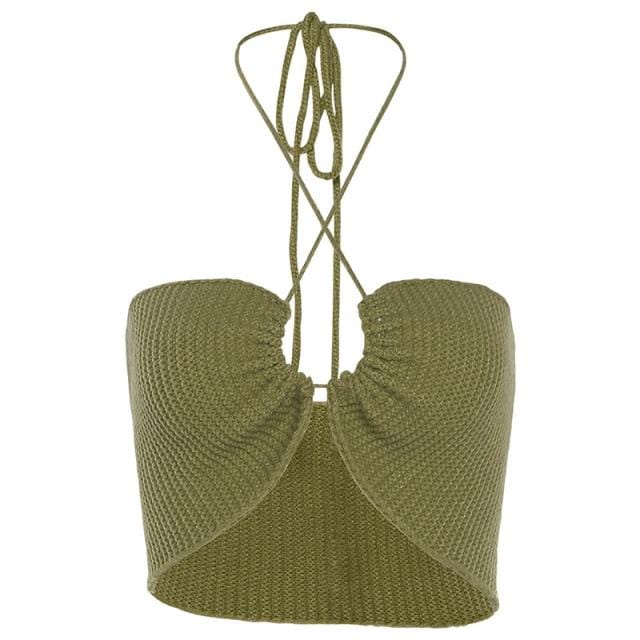 Cryptographic Summer Knitting Sexy Halter Crop Tops for Women Sleeveless Backless Bandage Cut-Out Top Cropped Club Party Outfits