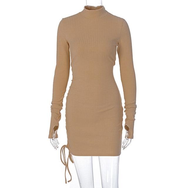 Dulzura Ribbed Stripe Women Mini Dress Drawstring Ruched Lace Up Long Sleeve Bodycon Bandage Sexy Party Elegant Autumn Winter
