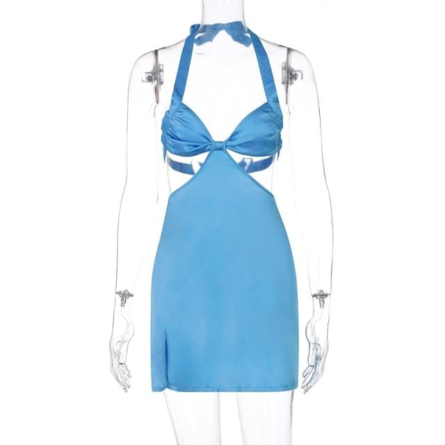 Dulzura Satin Women Halter Mini Dress Slit Lace Up Bandage Hollow Out Backless Sexy Streetwear Party Club Festival 2021 Summer