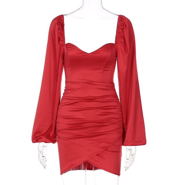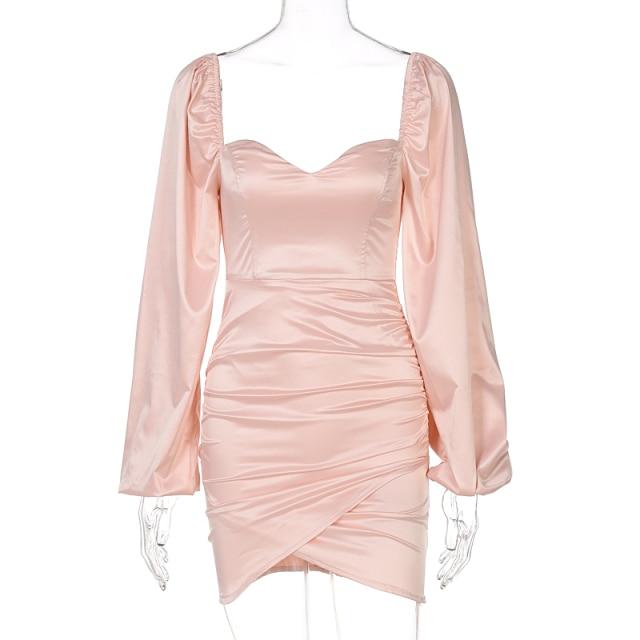 Dulzura Solid Women Satin Lantern Sleeve Mini Dress Slit Ruched Bodycon Sexy Party Elegant Streetwear Club 2021 Spring Summer
