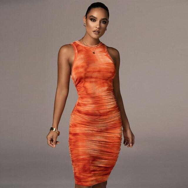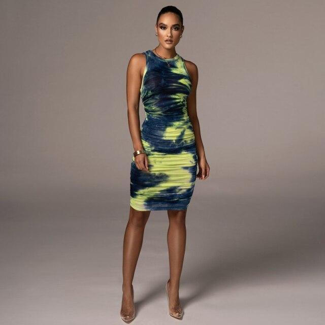 Dulzura Tie Dye Print Women Sleeveless Mini Dress Ruched Bodycon Sexy Party Elegant 2020 Autumn Winter Club Slim Lady Office