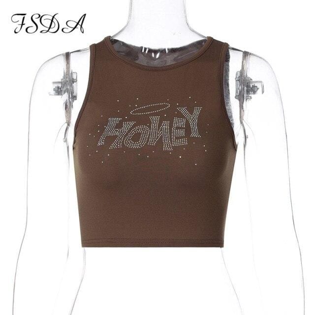 FSDA 2021 Brown Crop Top Women Sleeveless O Neck Summer Casual Party Fashion Letter Print Sexy Tank Tops Y2K
