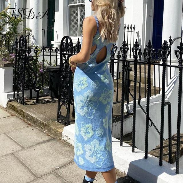 FSDA 2021 Print Knit Bodycon Dress Women Green Y2K Summer Hollow Out Sexy Sleeveless Spaghetti Strap Beach Midi Dresses Party