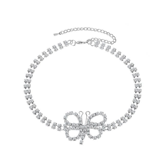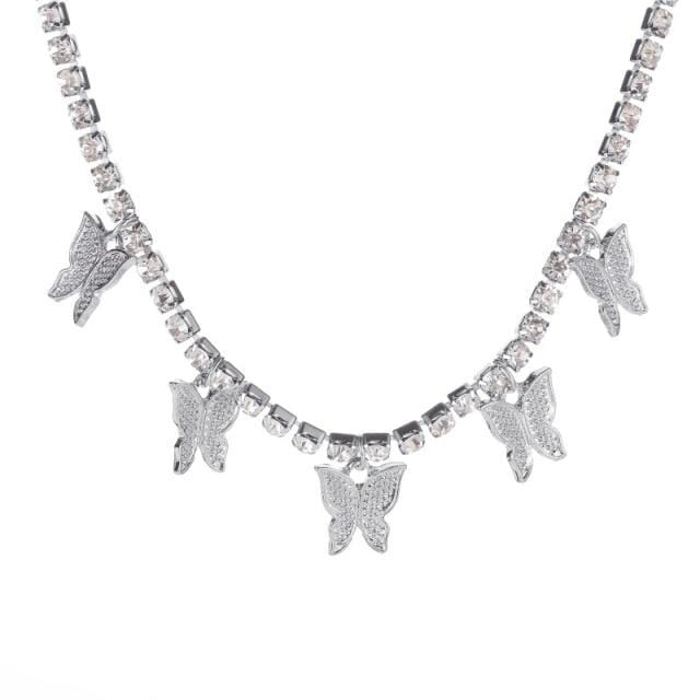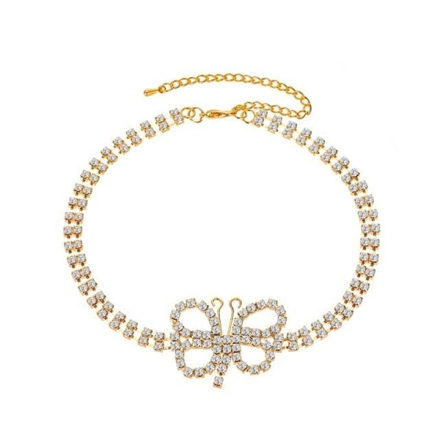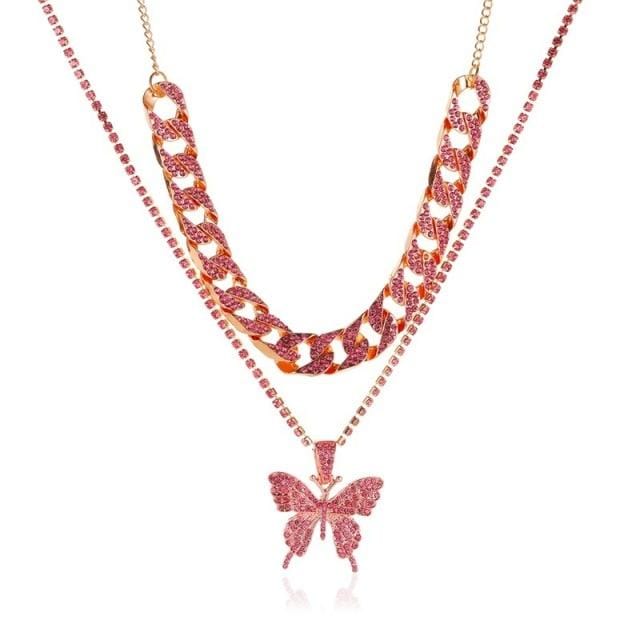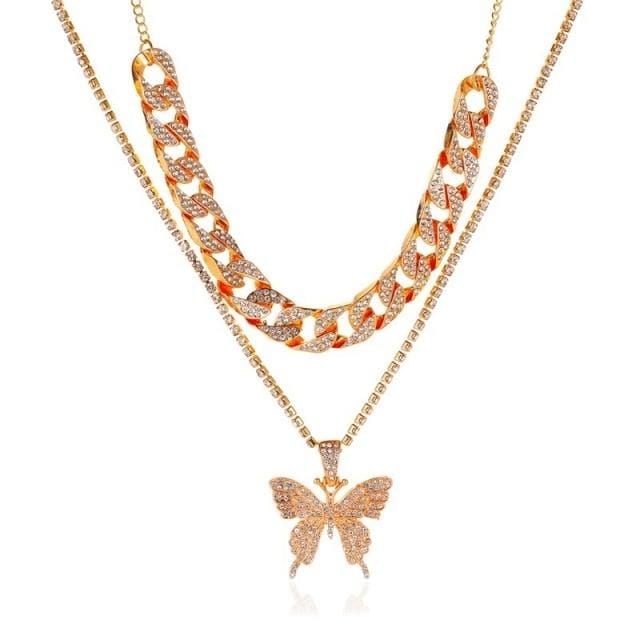 LATS Punk Cuban Double Layer Big Butterfly Pendant Necklace Full Rhinestone Gold Color Choker Thick Chain Necklace Women Jewelry