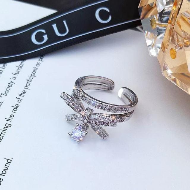 Luxury Shiny Zircon Bow Double Gold Opening Rings For Woman Korean Fashion Jewelry Gothic Accessories Girl's Unusual Ring Set