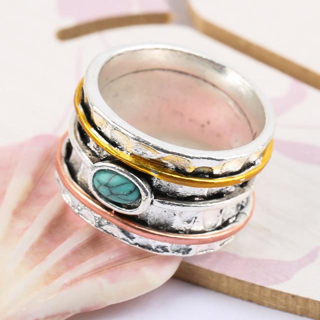 Retro Bohemian Style Width Ring Inlaid Oval Green Stone Ring Two Tone Design Finger Rings For Women Personality Jewelry G4M825