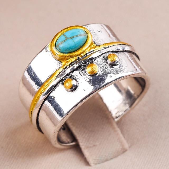 Retro Bohemian Style Width Ring Inlaid Oval Green Stone Ring Two Tone Design Finger Rings For Women Personality Jewelry G4M825