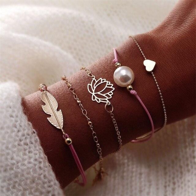 FNIO 2018 Retro 5Pcs/Set Bohemian Feather Flower Simulation Pearl Bracelets Set For Women New Beads Heart Chain Bracelet Jewelry