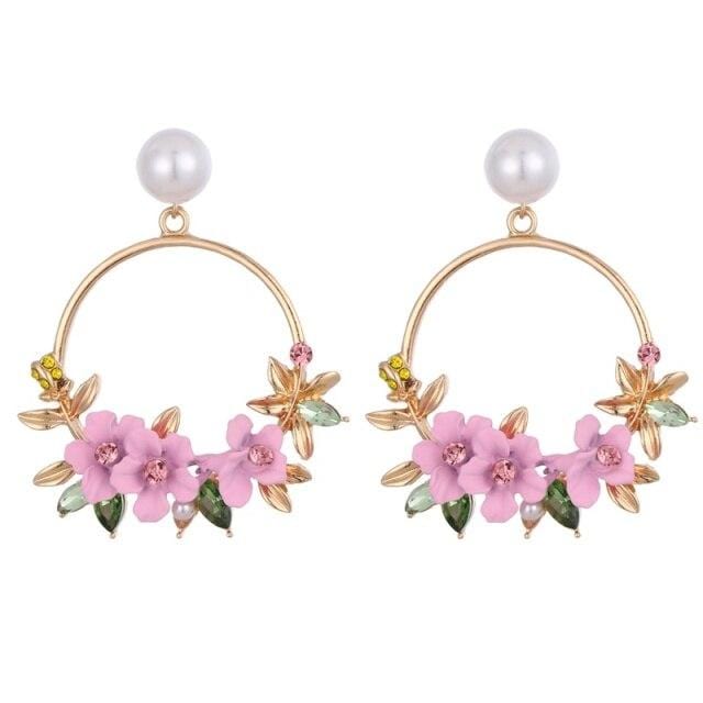 FNIO Trendy Pink Flower Earrings For Women Girls Jewelry Female Rhinestone Pearl Metal Round Circle Drop Earrings Gifts Brincos