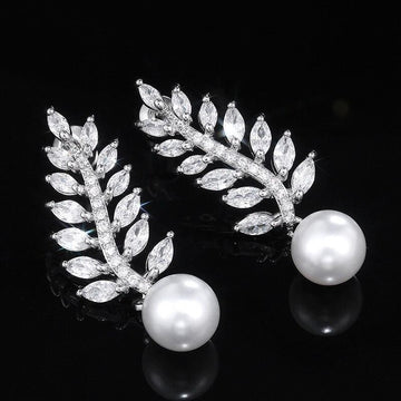 Huitan Crystal Leaf-shaped Dangle Earrings Women Round Imitation Pearl Simple Elegant Design High Quality Female Trendy Jewelry