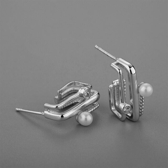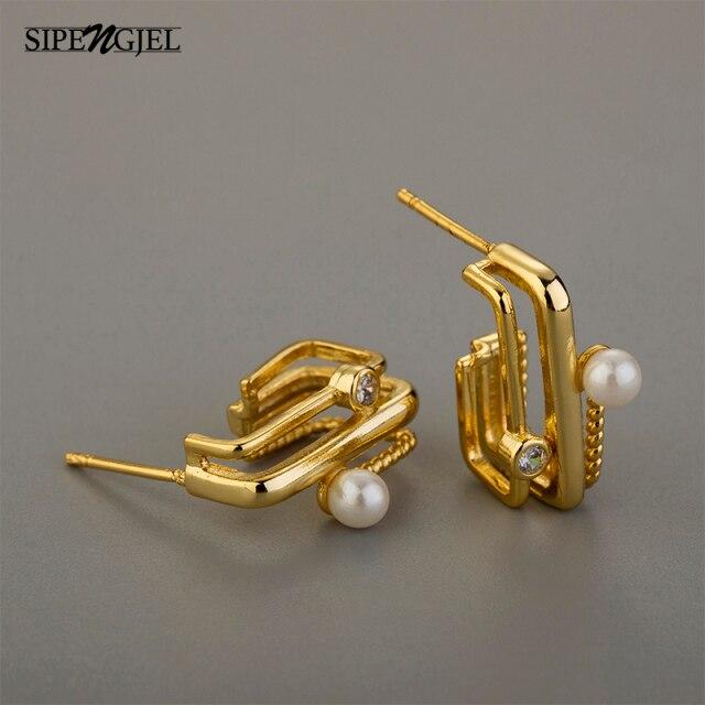 SIPENGJEL Fashion Creative metal Geometric square Stud Earrings Multi-layer Pearl Earrings For Women Travel Jewellry 2021