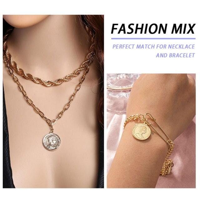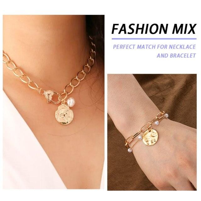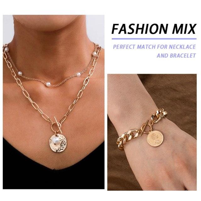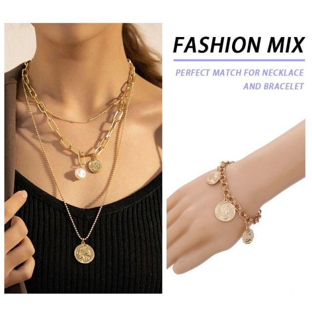 Fashion Multi-laye Pearl Jewelry Sets Chain Choker Necklace+Bracelet For Women Gold Metal Portrait Coin Heart New Design Gifts