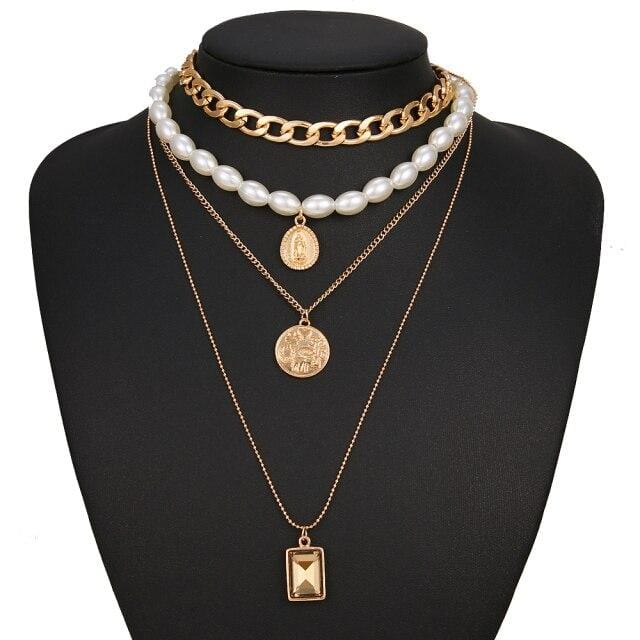 FNIO Punk Multi Layered Pearl Choker Necklace Collar Statement Virgin Mary Coin Crystal Pendant Necklace Women Jewelry