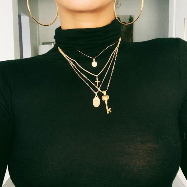 17KM 2019 Fashion Key Pendants Necklaces For Women Heart Flower Choker Necklace Ethnic Multilayer Female Bohemian Jewelry