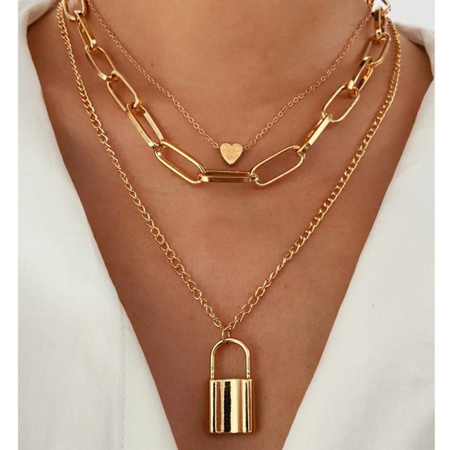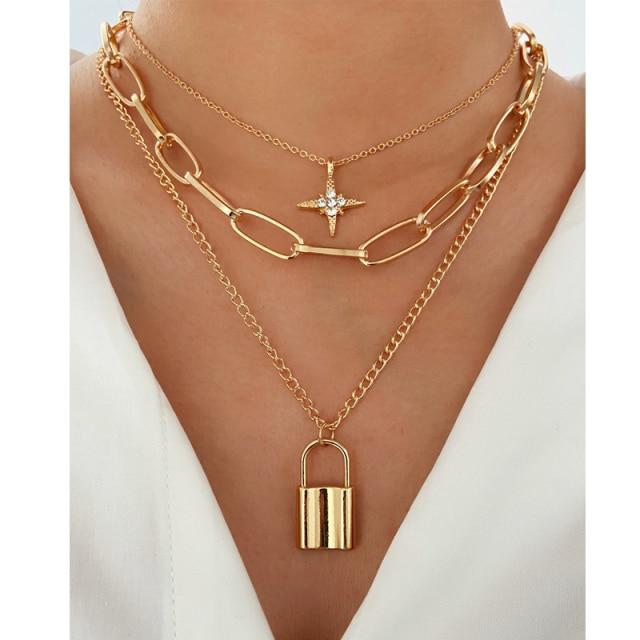 17KM Trendy Key Lock Pendant Necklace For Women Men Punk Big Chunky Chain Multilayed Lock Pendant Necklaces Jewelry Party