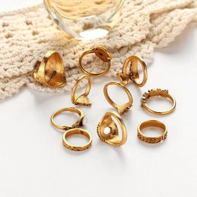 10 Pcs/set Bohemian Retro Crystal Flower Leaves Hollow Lotus Gem Ring Set Women Wedding Anniversary Gift wholesale