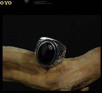 100%92 silver retro domineering men's silver ring personality black agate gem ring