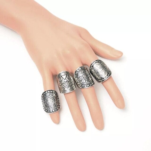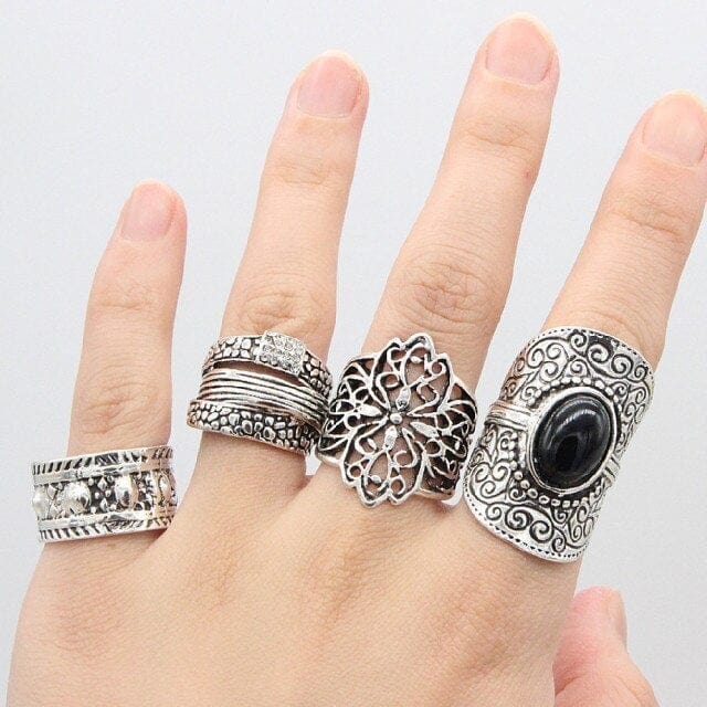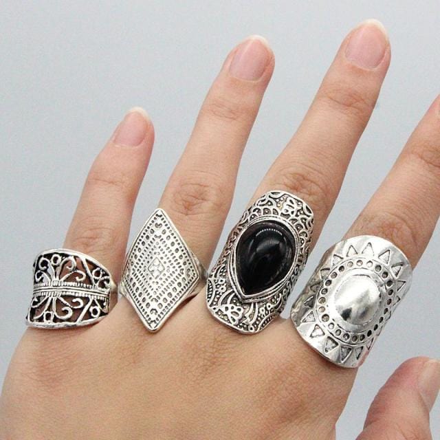 4Pcs/Set Bohemian Retro Crystal Flower Leaves Hollow Lotus Gem Silver Color Ring Set Women Wedding Anniversary Gift