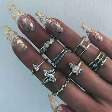 9 Pcs/set Bohemian Retro Crystal Flower Hollow Geometric Leaves Gem Gold Joint Ring Set Women Party Wedding Anniversary Gift