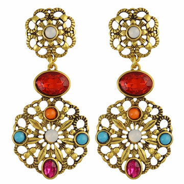 Bohemia Gypsy Retro Gold Hollow Out Flower Fashion Drop Earrings Inlay Red Gem Resin Bead Long Earrings For Women Jewelry