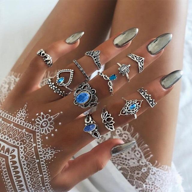 DIEZI 15 Pcs/set Bohemian Retro Crystal Flower Leaves Hollow Lotus Gem Silver Color Ring Set Women Wedding Anniversary Gift