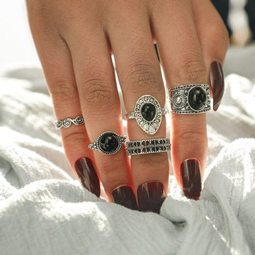 European and American Retro Black Gem Ring Set Water Drop Auspicious Cloud Ring Five-Piece Ring Set Sku3293