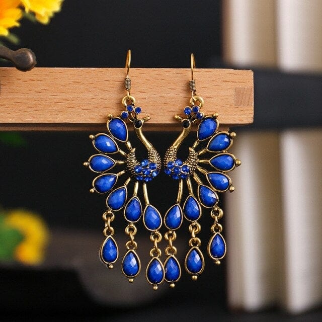 Hot selling retro peacock tail Earrings texture hollow out long gem alloy unusual fashion brand Earrings Jewelry Bohemia