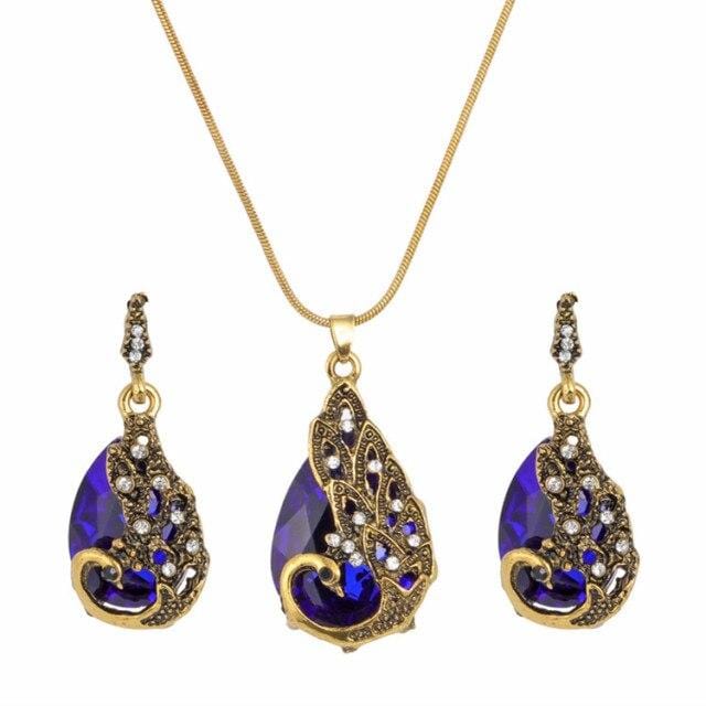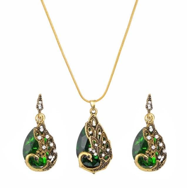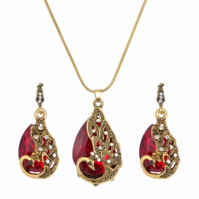 MINHIN European Retro Jewelry Set For Women Ethnic Crystal Gem Peacock Charms Necklace Earrings Set Gold Chain Wedding Sets