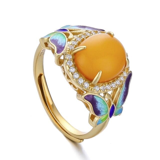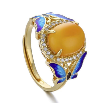 Natural Beeswax Gems Ring Cloisonne Retro Butterfly Rings S925 Sterling Silver Lady Open Ended Rings Ethnic Jewelry