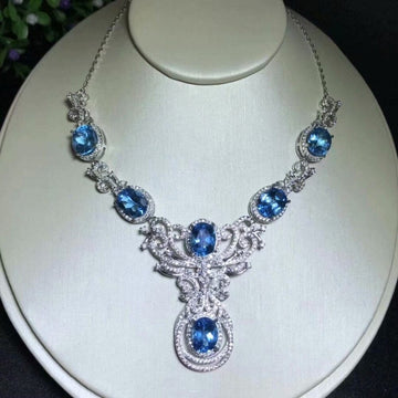 Natural blue topaz gem Necklace natural gemstone Pendant Necklace S925 silver Luxurious Retro Hollow women gift party Jewelry