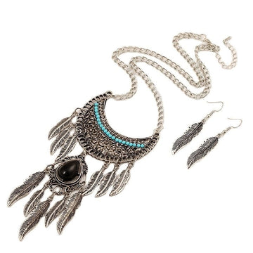 Retro Gem Leaves Tassel Necklace Earrings Set Trendy Bohemian Crescent Leaf Choker Necklaces Women Jewelry Set