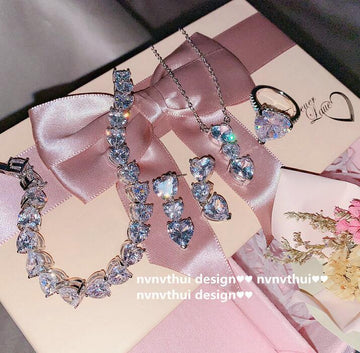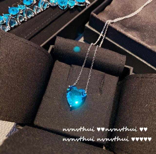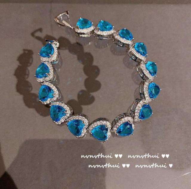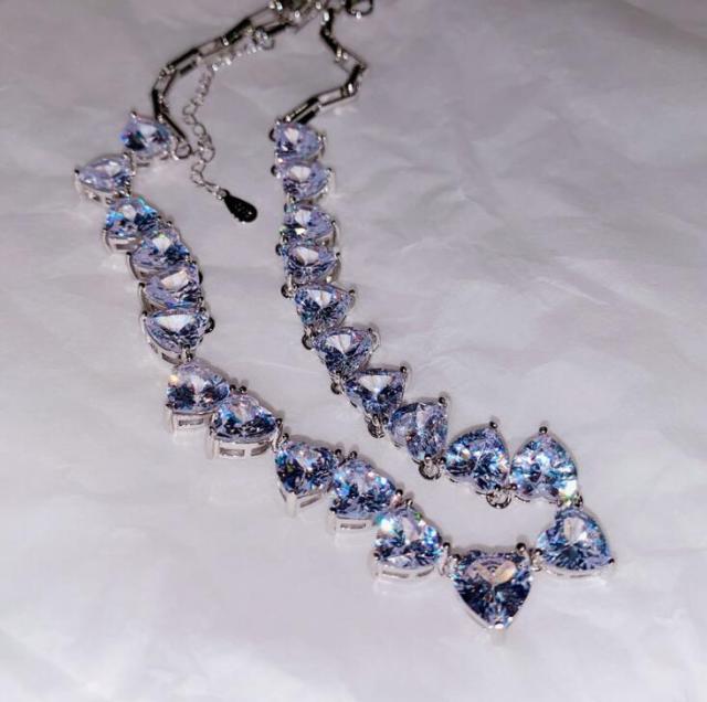 Retro oil painting blue love gem pendant zircon clavicle chain peach heart women necklace earrings vintage jewelry set