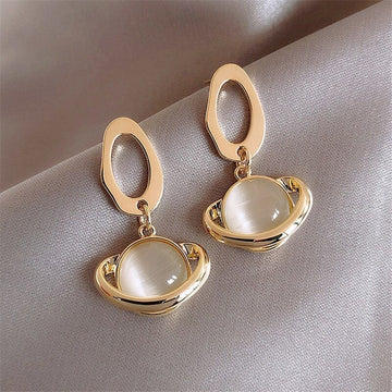 Retro Simple Fashion White Gem Opal Golden Planet Pendant Earrings Elegant Woman Party Banquet Jewelry Accessories Gift For Girl