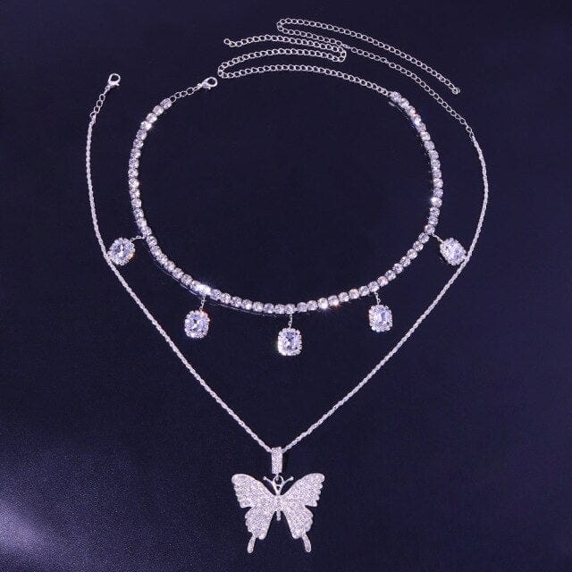Stonefans Retro Double Layer Thick Chain Necklace Rhinestone Choker Necklace Square Gems Big Butterfly Necklace Women Jewelry