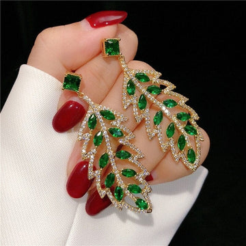 Temperament Retro Hollow Out Green Gem Feather Leaf Earrings Women Ss925 Pin Versatile Earrings