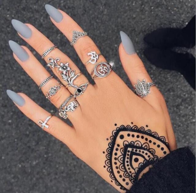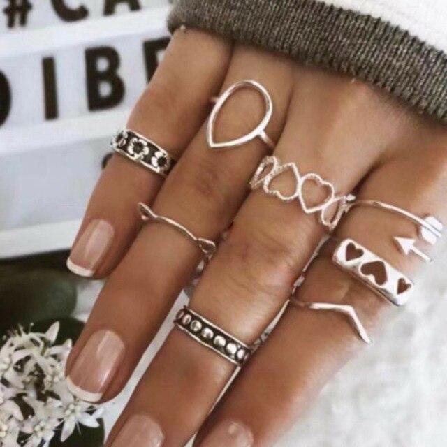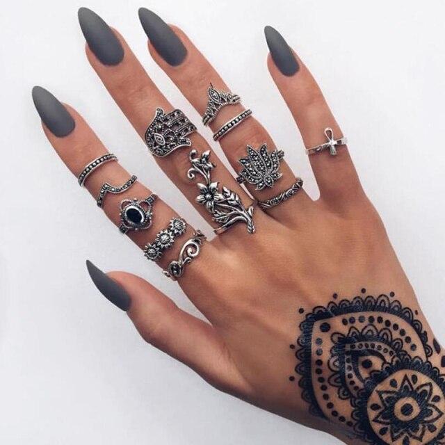 Tocona Boho Retro Crystal Gem Flower Hollow Gem Carved Silver Color Ring Set Women Wedding Anniversary Gift Ethnic Jewelry