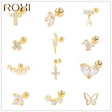 ROXI 925 Silver Crystal Ear Piercing Stud Earrings For Women Girls Butterfly Cross Pendientes Cartilage Earrings Wedding Jewelry