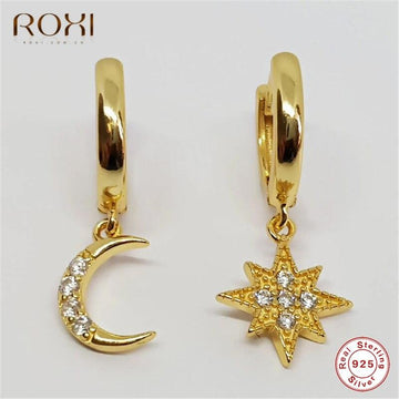 ROXI 925 Sterling Silver Earrings Asymmetry Delicate Moon Star CZ Stud Earrings for Women Fashion Jewelry Christmas Earring Gift